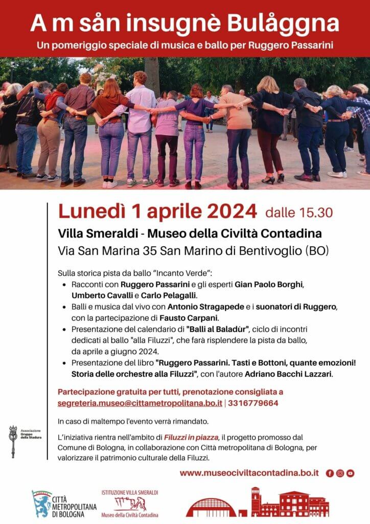racconti con Ruggero Passarini e gli esperti Gian Paolo Borghi, Umberto Cavalli eCarlo Pelagalli, balli e musica dal vivo con Antonio Stragapede e i suonatori di Ruggero, con la partecipazione di Fausto Carpani, presentazione del calendario di “Balli al Baladùr”, ciclo di incontri dedicati al ballo “alla Filuzzi”, che farà risplendere la pista da ballo, da aprile a giugno 2024 e presentazione del libro “Ruggero Passarini. Tasti e Bottoni, quante emozioni! Storia delle orchestre alla Filuzzi”, con l’autore Adriano Bacchi Lazzari, Minerva edizioni.