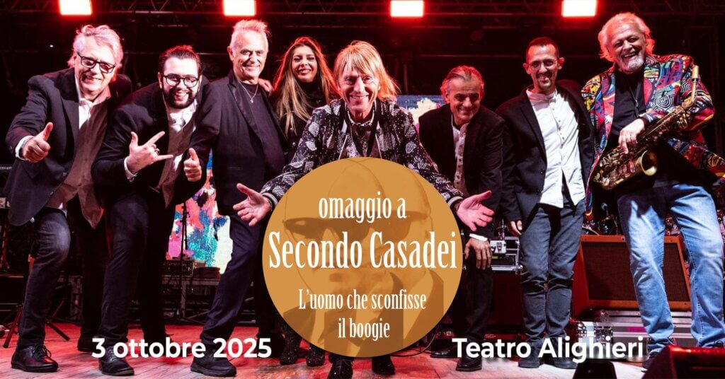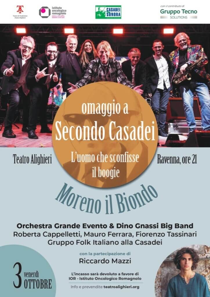 Venerdì 3 ottobre ore 21,  al Teatro Alighieri di Ravenna avrà luogo – L’uomo che sconfisse il boogie – un grande concerto dedicato a come Secondo Casadei seppe ripristinare il primato del liscio in sala da ballo dopo l’invasione dei generi d’oltreoceano nell’immediato dopoguerra.  Moreno il Biondo e l’Orchestra Grande Evento e la Dino Gnassi Big Band con la partecipazione di Roberta Cappelletti, Mauro Ferrara, Fiorenzo Tassinari, Gruppo Folk Italiano alla Casadei e Riccardo Mazzi esplorano l’eredità musicale di Secondo Casadei anche attraverso la lente di un genere quale il jazz, dei cui stilemi anche Casadei seppe appropriarsi in un uso libero e intelligente, fra appropriazioni e reinvenzioni, studiando i dischi di Duke Ellington, Armstrong, Ella Fitzgerald, Glenn Miller e Count Basie. Una contaminazione da riscoprire alternando il liscio della tradizione agli arrangiamenti in chiave jazz. L’incasso della serata, realizzata in collaborazione con Casadei Sonora e con il contributo di Gruppo Tecno Solutions, sarà devoluto in beneficenza a favore dello IOR – Istituto Oncologico Romagnolo