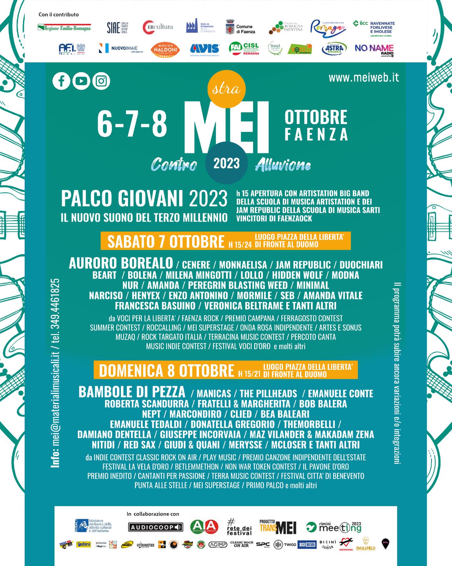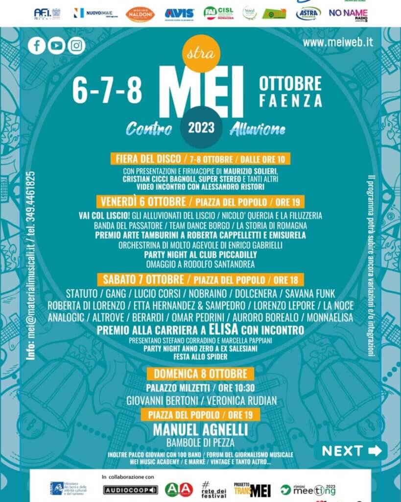 Il 7 Ottobre dalle ore 18.00 sul Palco centrale del MEI in Piazza del Popolo a Faenza si esibiranno i Savana Funk vincitori del premio Migliori artisti Emergenti, i Nobraino, che ritireranno il premio alla carriera, Elisa che ritirerà il premio alla carriera nel prestigioso Salone dell’Arengo (Piazza Martiri della Libertà, 1 Faenza), per l’occasione ci sarà un talk tra l’artista e il giornalista Riccardo De Stefano, in cui si ripercorreranno i momenti salienti della carriera della cantante (ore 16.30 – ingresso libero). Lucio Corsi vincitore della targa MEI Migliore Artista Indipendente Dell’Anno, Dolcenera, Gang che ritirerà il premio alla carriera, Statuto che ritirerà il premio alla carriera. Inoltre, anche per l’edizione del 2023, ci sarà il ritorno del Palco Giovani in Piazza del Duomo, tra i primi nomi: Miss Frenny, Cenere, Nur e Amanda, Peregrin Blasting Weed, Artes e Sonus, Jam Republic, Minimal, Muzaq, Duochiari, Etta, Roberta Di Lorenzo, Lorenzo Lepore, La Noce, Berardi, Altrove, Hernandez e Sampedro, Analogic.
