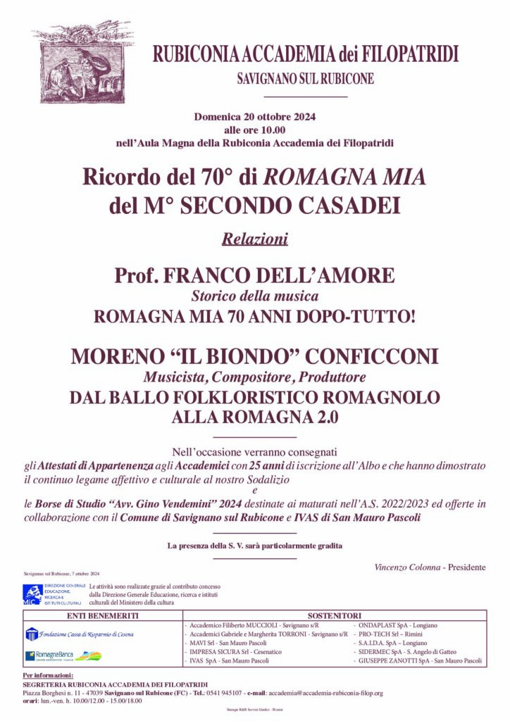 La storia del valzer Romagna mia – composto nel 1954 da Secondo Casadei e il cui successo è semplicemente mondiale – rimanda all’imponderabilità del successo di un brano musicale. Cercare di individuare i motivi e le caratteristiche che possono fare la fortuna di una creazione artistica, è come credere all’intervento di un deus ex machina, di cui nemmeno le grandi case discografiche riescono a dotarsi. Si può dire, invece, del processo di identificazione nel brano che ne scaturì e del ruolo di bandiera musicale della Romagna, cui tuttora il valzer adempie. Se il titolo fosse rimasto quello iniziale di Casetta mia non sarebbe diventato – credo – il brano più eseguito dalle orchestre da ballo italiane. Bene fece Casadei a raccogliere il suggerimento, datogli da Carlo “Cafer” Ferrini, di mutare il nome della canzone. Quest’ultimo aveva già, nel 1950, composto un valzer intitolato Romagna mia, ma il destino si è