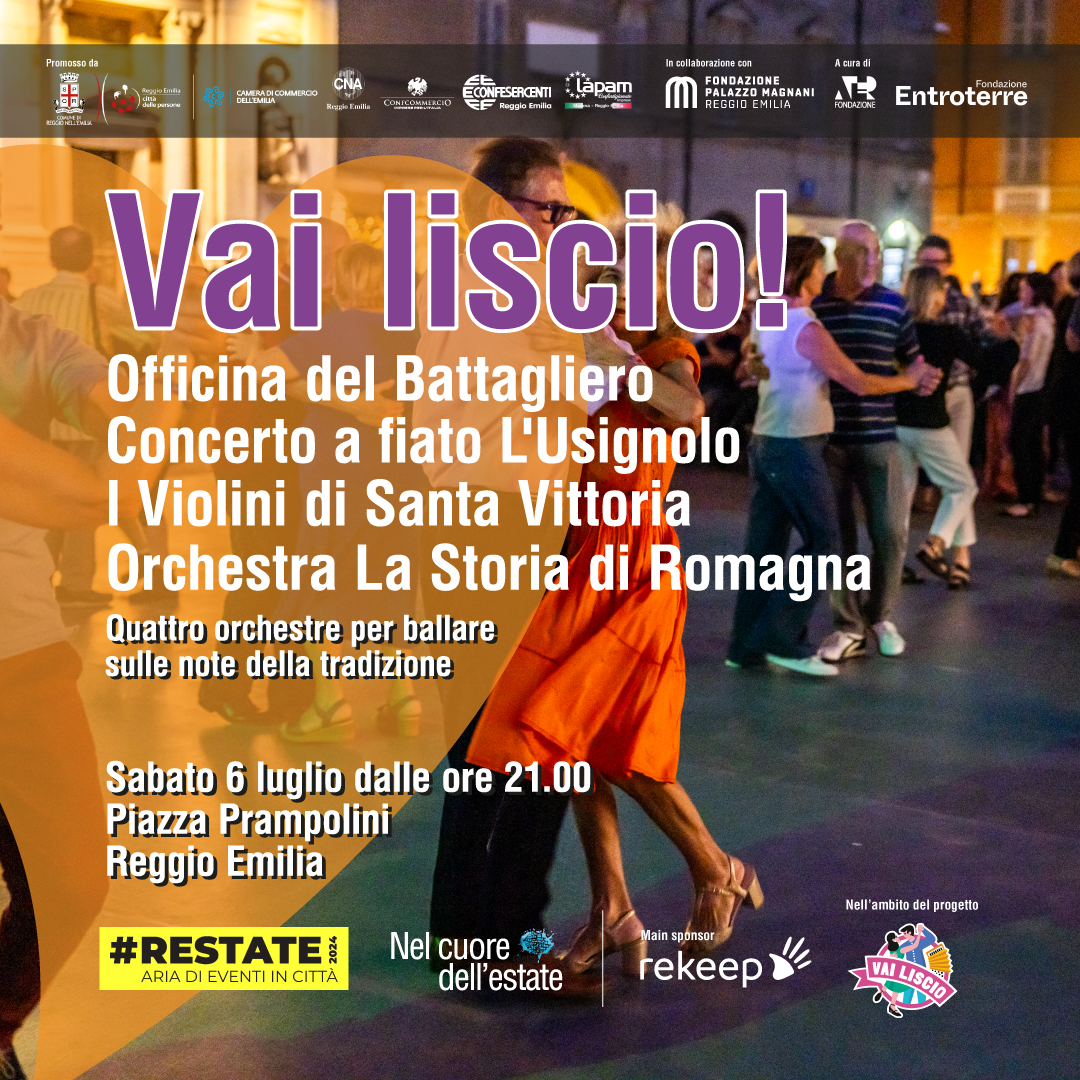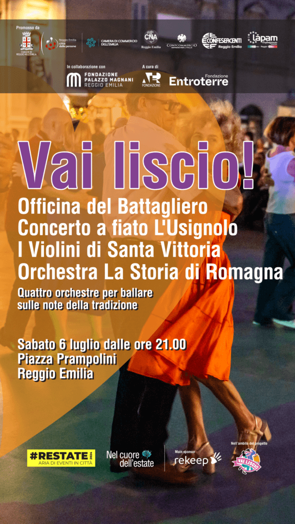 Il 6 luglio piazza Prampolini si trasforma, a partire dalle 21, in una grande balera con Vai liscio! un evento che vede la collaborazione tra il Comune di Reggio Emilia e la Regione Emilia-Romagna, con la partecipazione di orchestre provenienti da tutto il territorio regionale. In piazza sarà installata una vera e propria pista da ballo, mentre sul palco saliranno 4 orchestre di liscio: Concerto a fiato L’Usignolo, l’Orchestra La Storia di Romagna, I Violini di Santa Vittoria e l’Officina del Battagliero.