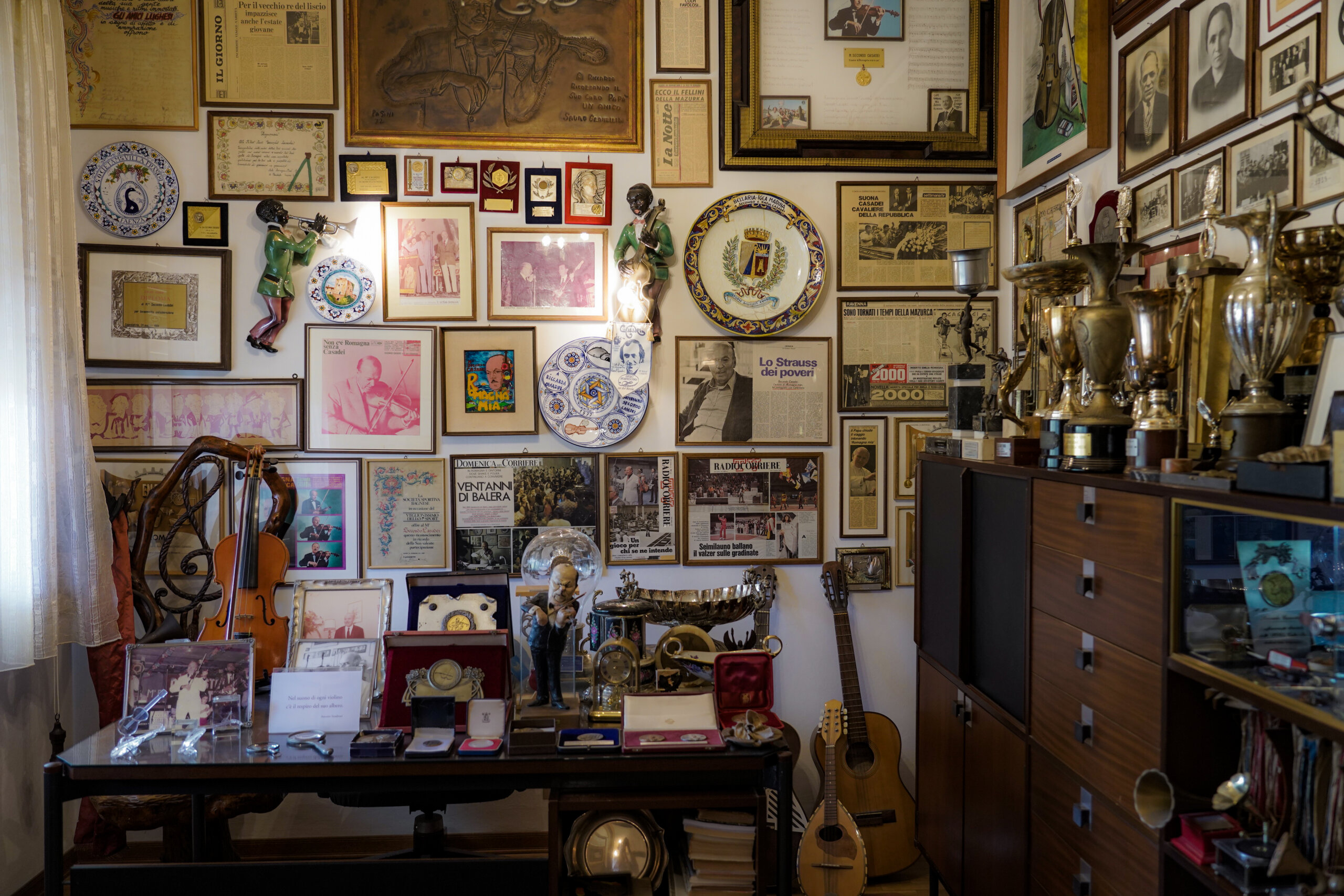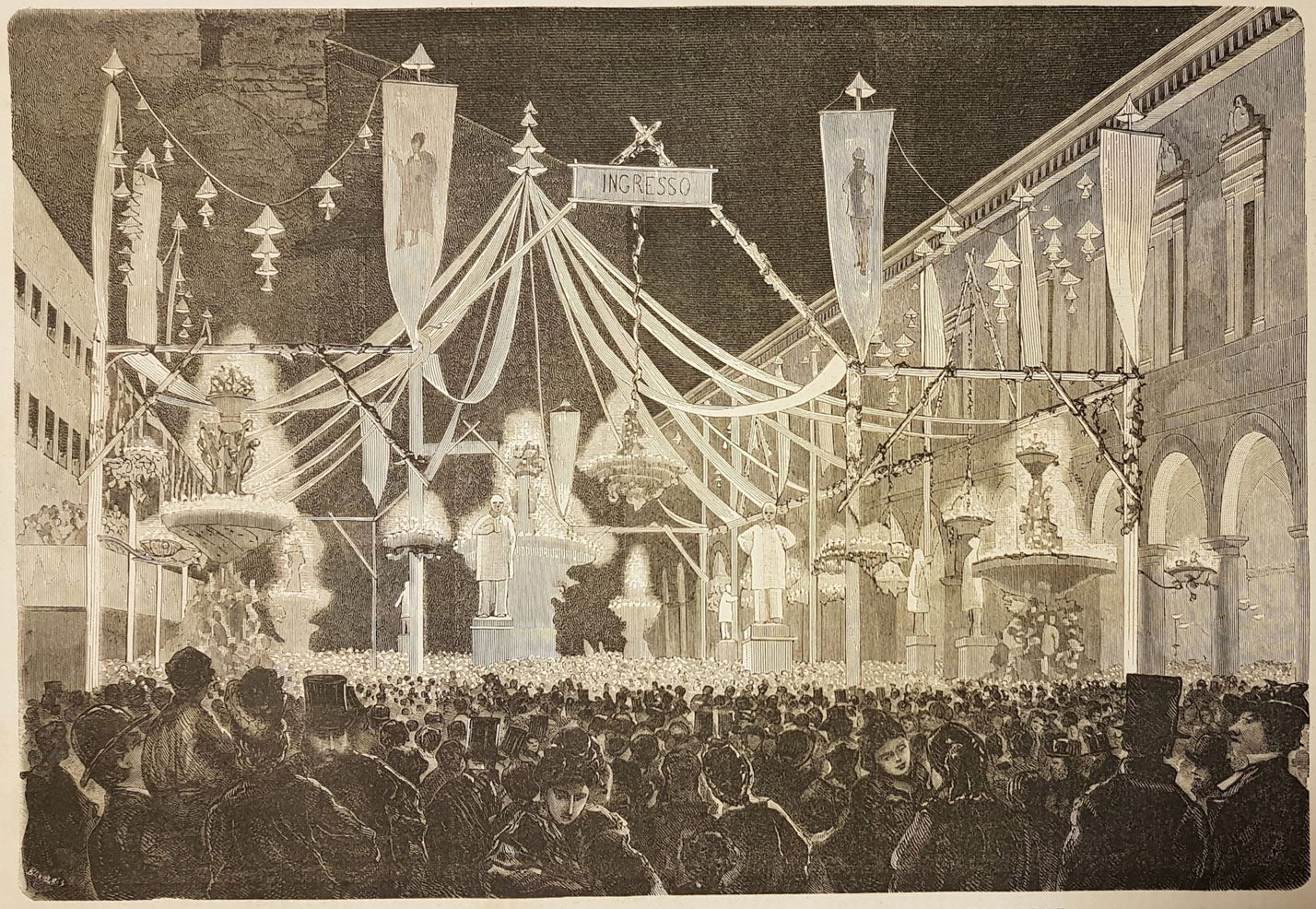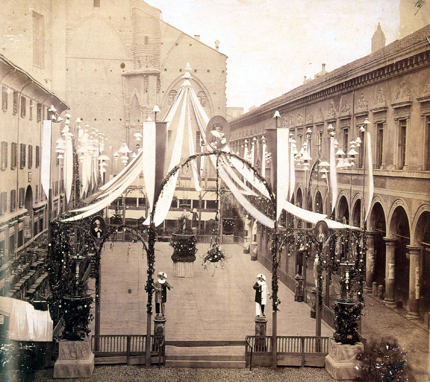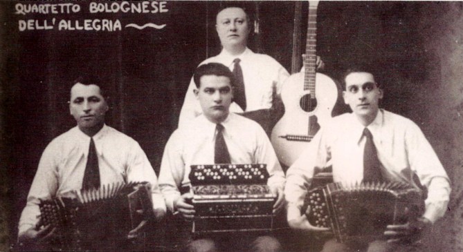 Il Quartetto Bolognese dell’Allegria. Foto scattata nel 1828. Con l’organetto da sinistra a destra: Gastone Toschi, Attilio Biagi e Amleto Parisini. In piedi, con la chitarra bolognese, Umberto Venturi.