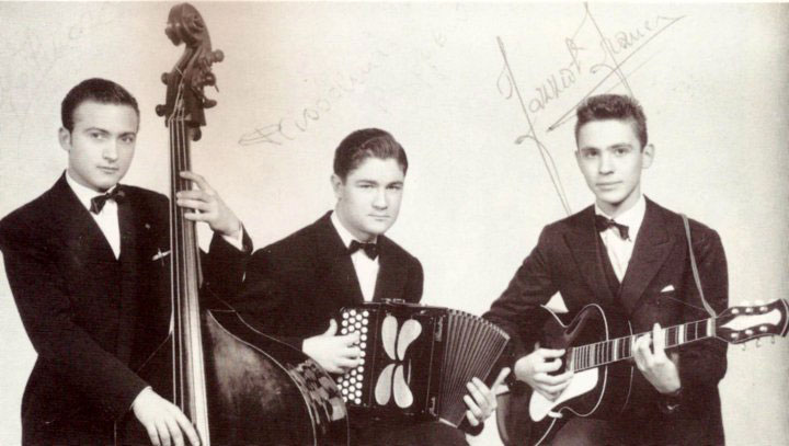 Il Trio Passarini nel 1956. Il quindicenne Ruggero Passarini al centro, Elmore Gamberini al contrabbasso e Franco Fazioli alla chitarra.