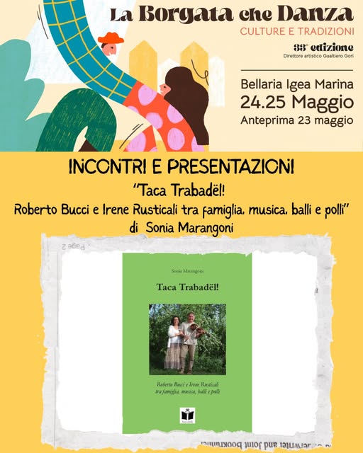 • Alle 18:30, seguirà la presentazione del libro di Sonia Marangoni “Taca Trabadël!! Roberto Bucci e Irene Rusticali tra famiglia, musica, balli e polli”. Saranno presenti Roberto Bucci e Sonia Marangoni