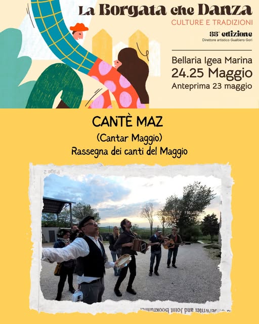 • Sabato 24 maggio, alle ore 17:00 si aprirà una finestra sulle forme residuali, e tutt’ora attive, dei riti di questua del Maggio lirico, profano e religioso, nei territori compresi fra Marche, Romagna ed Emilia, che nella notte fra il 30 aprile e il primo maggio di ogni anno, celebrano con suoni e canti l’avvento della primavera. Riti che un tempo erano presenti in molti luoghi della Romagna. Porteranno la propria testimonianza Placida Staro (etnomusicologa) con un inquadramento generale, e i gruppi: Voci di Marca, La Compagnia di Viva el Ball!, L’Uva Grisa, I Maggiaioli di Casola Valsenio, I Suonatori della Valle del Savena.