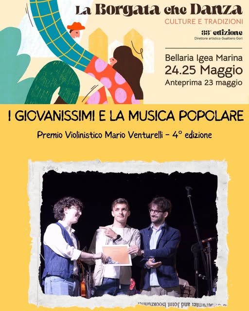 Con la Scuola primaria “G. Pascoli”/“G. Carducci” dell’I.C. di Bellaria Igea Marina, partecipe quest’ultima alla festa fin dalla prima edizione del 1993, in collaborazione con il corpo insegnante, dallo scorso anno l’attenzione si focalizza sui balli etnici romagnoli, e da quest’anno si sperimenterà il coinvolgimento nei balli anche dei famigliari degli alunni (domenica 25 maggio ore 19:00). A rafforzare questi intenti, sempre nella serata di anteprima (venerdì 23 maggio ore 22:00), avrà luogo la quarta edizione del Premio violinistico “Mario Venturelli”, che da quest’anno sarà assegnato, per la prima volta, a due studenti scelti sia fra i principianti sia fra i più talentuosi delle scuole della zona. Infine l’eclettica orchestra di ottoni e percussioni “Alibanda” dell’I.C. “D. Alighieri” di Rimini, (sabato 24 maggio ore 20:00) arricchirà con la propria esperienza gli esiti di questi importanti percorsi didattici sulla “trasmissione della tradizione”.