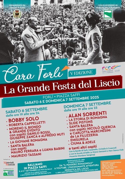 Dopo il grande successo delle prime quattro edizioni di Cara Forlì, torna in Piazza Saffi sabato 6 e domenica 7 settembre, La Grande Festa del Liscio, evento promosso dall’Amministrazione Comunale e organizzato in collaborazione con la Famiglia di Secondo Casadei e con il sostegno della Regione Emilia Romagna-Assessorato alla Cultura.